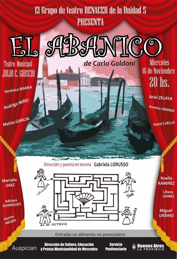 El proximo miercoles 16 de noviembre, a las 20 horas, en el Centro Cultural Julio C. Gisocio, se presentara una nueva obra del grupo de Teatro Renacer de los intenos de la Unidad 5 de Mercedes, denominada «El Abanico», dirigida y puesta en escena de la Porfesora Gabriela Lorusso.