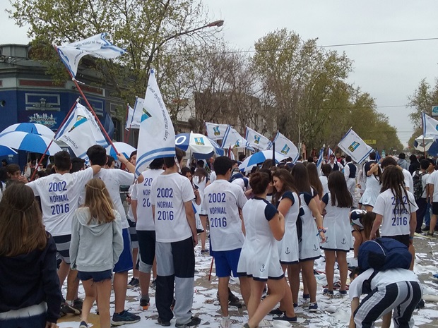 Nacional con su azul, amarillo y blanco también se dejó ver, al menos un grupo, por las calles y la Plaza San Martín y así cada una de las escuelas celebrantes.
