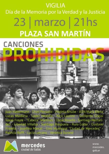 En la noche de este jueves 23 de marzo se llevará a cabo la vigilia ante un nuevo aniversario de la noche trágica que dio inicio a los años de terrorismo de Estado iniciados en 1976. Para conmemorar esta fecha y reclamar Memoria, Verdad y Justicia. Desde la hora 21 de este jueves, en la Plaza San Martín, la vigilia será con una agenda musical en donde artistas locales interpretarán «Canciones Prohibidas». La propuesta libre, pública y gratuita y tiene un nutrido cronograma para todos los gustos.