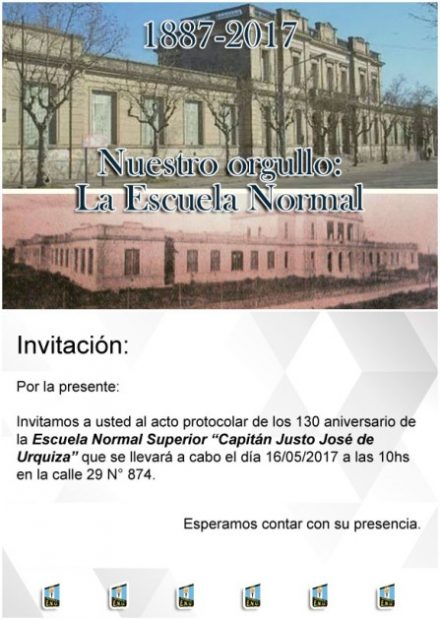 La comunidad educativa de la Escuela Normal Superior «Capitán Justo José de Urquiza» hace extensiva la invitación a los festejos por sus 130 años desde su creación. Los mismos serán el mismo día que se recuerda su fundación en 1887. El venidero 16 de mayo, a partir de la hora 10, el festejo protocolar será sobre la avenida 29, entre 36 y 38.