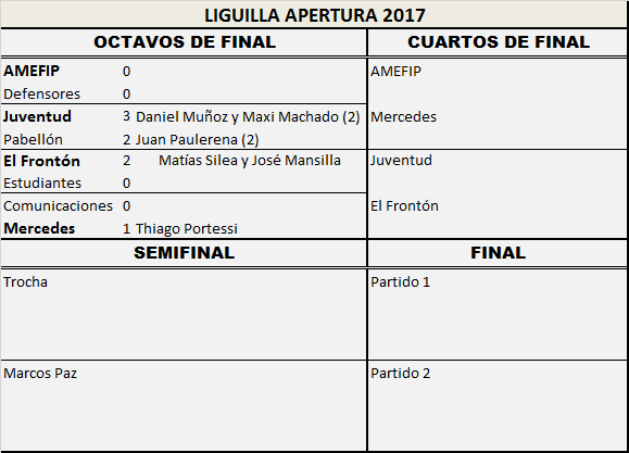 Por ventaja deportiva, en cancha de la Liga Mercedina, AMEFIP – San Martín eliminó a Defensores, tras empatar cero a cero. El Frontón, en el segundo tiempo, con goles de Paolacci y Silea eliminó a un Estudiantes que presentó caras nuevas, mientras que Juventud transpiró demasiado ante Pabellón de Marcos Paz, ya que empezó ganando el partido, se lo dieron vuelta y sobre el final pudo remontar la historia.