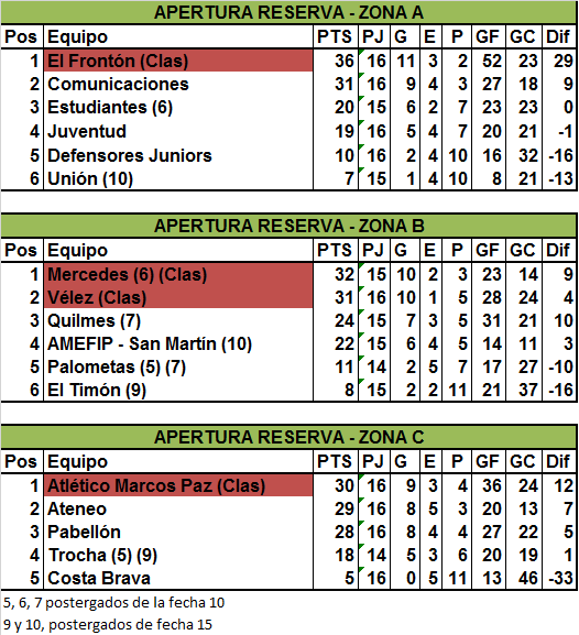 En este sentido, por la fecha 2, Juventud perdió 2 a 1 ante Mercedes, por la 3 Comunicaciones derrotó 3 a 0 a AMEFIP y Vélez lo hizo por 5 a 3 a El Frontón en el postergado de la décima.