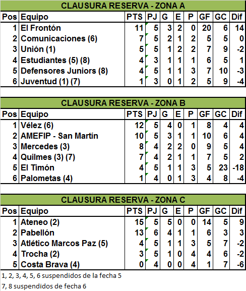 Con dos partidos suspendidos se jugó este sábado la sexta fecha del torneo de Reserva de la Liga Mercedina de Fútbol que tiene varios encuentros adeudados. El Frontón frenó su racha de victorias con un empate como local ante Unión, pero sigue liderando la Zona A. En la B, AMEFIP empató con Mercedes y eso le posibilitó a Vélez ser el nuevo líder, ya que derrotó a Trocha. En la Zona C, Ateneo goleó a El Timón y Pabellón perdió terreno tras perder ante Comunicaciones.