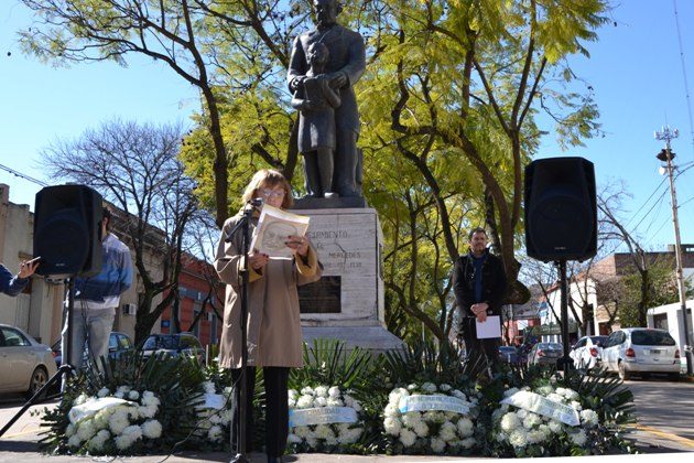 Con pocas banderas en el acto y tras el Himno Nacional Argentino, las autoridades presentes colocaron las ofrendas florales a los pies del monumento. El Intendente Municipal Juan Ignacio Ustarroz y la Directora de Cultura y Educación, Lucía Capaccio, colocaron las flores en representación de la comuna. Por su parte, Margot Loiza de Mendez y Olga Coronel, en nombre del a Biblioteca Sarmiento colocaron las ofrendas de la institución. Finalmente, en representación del Concejo Deliberante, colocaron la ofrenda los legisladores locales Matías Dematei y José Cestari. También se colocaron ofrendas en nombre de la Unión de Educadores Bonaerenses y el Colegio de Escribanos.