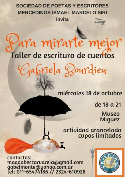 Desde la Sociedad de Poetas y Escritores Mercedinos «Ismael Marcelo Siri» invitan a la comunidad al taller de escritura de cuentos «Para Mirarte Mejor». El taller está a cargo de Gabriela Bourdieu y se hará el miércoles 18 de octubre, entre las 18 y las 21 horas en el Museo Histórico Víctor Míguez (calle 12 y 23). Al ser una actividad con cupo limitado y arancelada se recomienda consultar a los teléfonos (011) 65474186 ó (02324) 610928.