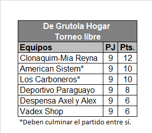 A pesar de la sanción, Clonaquim-Mia Reyna encabeza aún la tabla de posiciones. En esta oportunidad sumó los dos puntos por la no presentación de Despensa Axel y Alex. Al primero se le dio el encuentro ganado por uno a cero. El próximo fin de semana jugará contra American Sistem-Gowland y podría consagrarse campeón.