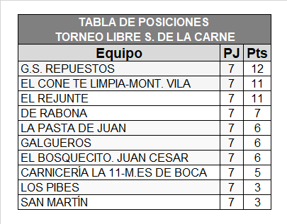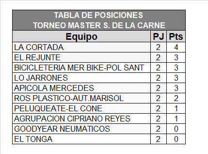 El Rejunte y El Cone Te Limpia-Montajes Vila, se midieron ante Carnicería la 11-Mercedes es de Boca y Los Pibes, respectivamente. El dinámico equipo del Rejunte, no la tuvo fácil, pero se las supo arreglar con una buena táctica para quedarse con el marcador final por dos goles a uno, y llegar a los once puntos, la misma cantidad que cosecha El Cone Te Limpia-Montajes Vila, que ajustadamente ganó su enfrentamiento ante un complicado adversario, Los Pibes, por la mínima diferencia.