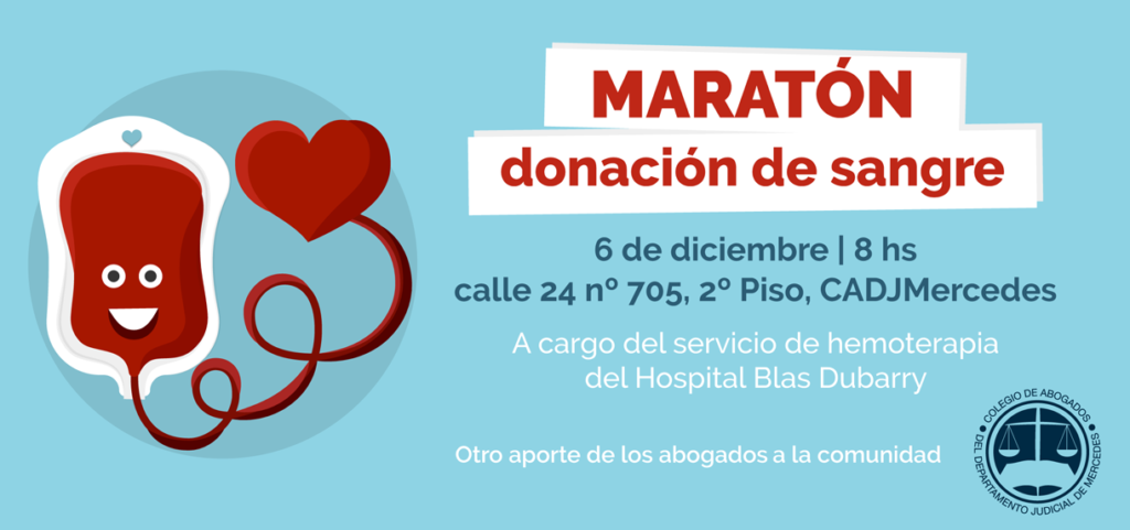 Para este jueves 6 de diciembre, el Colegio de Abogados del Departamento Judicial Mercedes invita a donar sangre. En su sede de 24 y 29, desde la hora 8, el Servicio de Hemoterapia del Hospital Blas L. Dubarry estará recibiendo a quienes quieran donar sangre en una maraton que se extenderá a lo largo de la mañana.