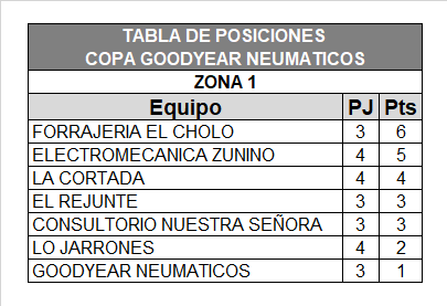 La gente del Cone viene afianzándose cada jornada de fútbol. Está primero en la zona a y ya puede dormir en paz, sabiendo que consiguió colocarse en la liguilla final. El sábado por la tarde igualó uno a uno contra Verdulería Rocío. A pesar de no triunfar, pero si sumar de a uno, los verduleros deberán trabajar un poco más en la próxima fecha para poder avanzar; también tendrán que culminar entre semana un partido que se postergó contra El Rejunte. El Rejunte goleó al Cervecero, mejor conocido como Quilmes, por cuatro a dos. El vigente campeón de la Copa Mercedes Deportes, también puede decir que sigue en pie y a paso firme. Se coloca segundo con 7 puntos. Gimnasio M&M (ex GS Repuestos), terminó tres a tres frente a Restó Ravello. Los de M&M se suben a bordo del barco para viajar a la próxima etapa. En la que aconteció con la acción futbolística de la zona B, Galgueros y San Martín son los principales protagonistas, y ya tienen en mente la liguilla. Los del barrio salieron victoriosos por la mínima diferencia uno a cero contra Vadex Shop-Junín; mientras que los Galgueros apabullaron cuatro a uno a la gente de Estudio Jurídico Pagano-Poggio. Los Pibes levantaron su gran nivel tan característicos que habitualmente muestra en lo colectivo e individual, a pesar de que no haber comenzado el torneo con las lues bien encendidas, pero se acomodó y hasta ahora suma 8 unidades. En su presentación del sábado, empató uno a uno frente al Bosquecito-Peluquería Juan Cesar.