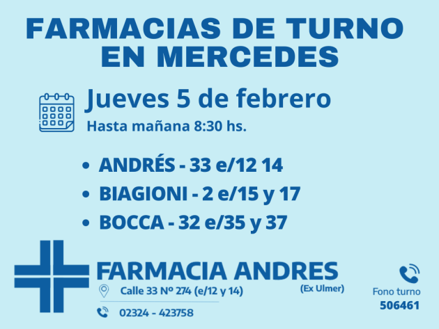 Farmacias de turno día viernes 19 de julio 19 julio, 201919 julio, 2019 Comparir Compartir en WhatsApp (Se abre en una ventana nueva) WhatsApp Compartir en Telegram (Se abre en una ventana nueva) Telegram Compartir en X (Se abre en una ventana nueva) X Comparte en Facebook (Se abre en una ventana nueva) Facebook Compartir en Threads (Se abre en una ventana nueva) Threads SEGUÍ LEYENDO EN HOY MERCEDES Búsqueda Laboral: Casero Club de Leones realiza control gratuito de glucosa Farmacias de turno del jueves 5 de febrero Farmacias de turno del miércoles 4 de febrero