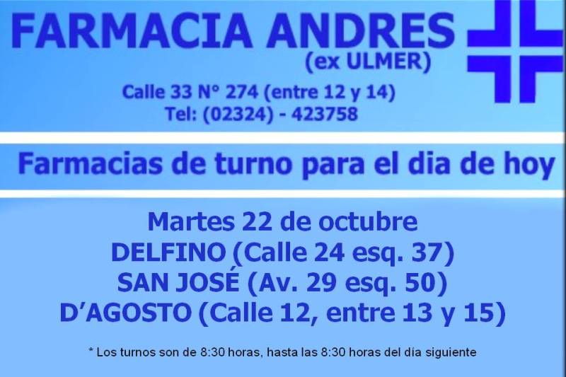 Farmacias de turno día martes 22 de octubre 22 octubre, 2019Desde hoy a las 8:30 y hasta mañana la misma hora, las farmacias de turno son: DELFINO, SAN JOSE y D’AGOSTOComparte esto: Haz clic para compartir en WhatsApp (Se abre en una ventana nueva) WhatsApp Haz clic para compartir en Telegram (Se abre en una ventana nueva) Telegram Haz clic para compartir en X (Se abre en una ventana nueva) X Haz clic para compartir en Facebook (Se abre en una ventana nueva) Facebook TE PUEDE INTERESARCOMENTARIOS Comentarios