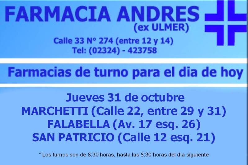 Farmacias de turno día jueves 31 de octubre 31 octubre, 2019Desde hoy a las 8:30 y hasta mañana la misma hora, las farmacias de turno son: MARCHETTI, FALABELLA y SAN PATRICIOComparte esto: Haz clic para compartir en WhatsApp (Se abre en una ventana nueva) WhatsApp Haz clic para compartir en Telegram (Se abre en una ventana nueva) Telegram Haz clic para compartir en X (Se abre en una ventana nueva) X Haz clic para compartir en Facebook (Se abre en una ventana nueva) Facebook TE PUEDE INTERESARCOMENTARIOS Comentarios