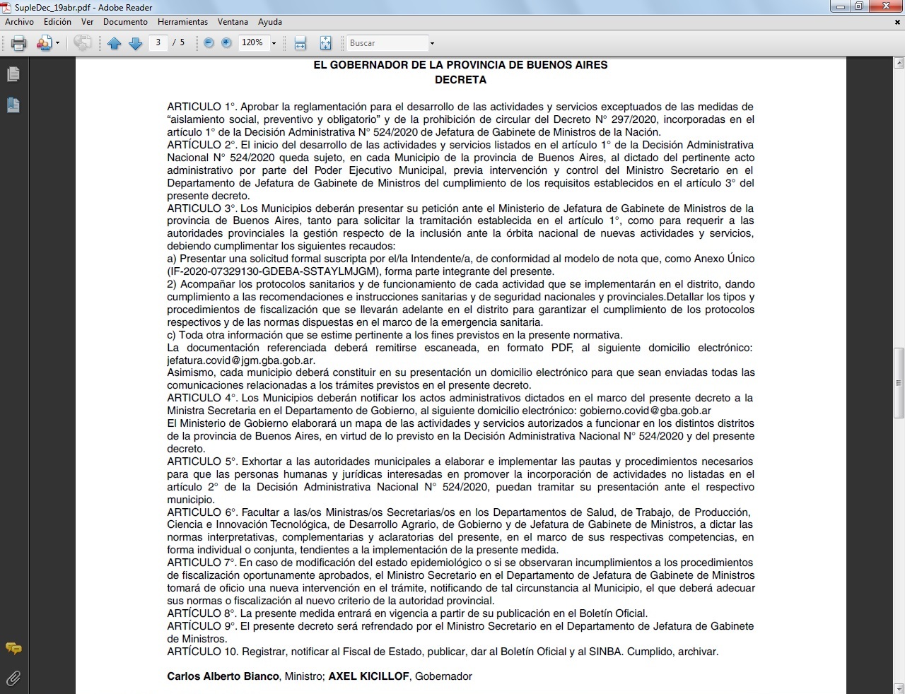 El decreto de este domingo firmado por Kicillof establece que la Provincia debe determinar cómo se implementan las excepciones autorizadas a partir de estrictos protocolos sanitarios. Para ello, los municipios deberán presentar su petición ante el Ministerio de Jefatura de Gabinete de Ministros de la provincia de Buenos Aires y solicitar la tramitación establecida.