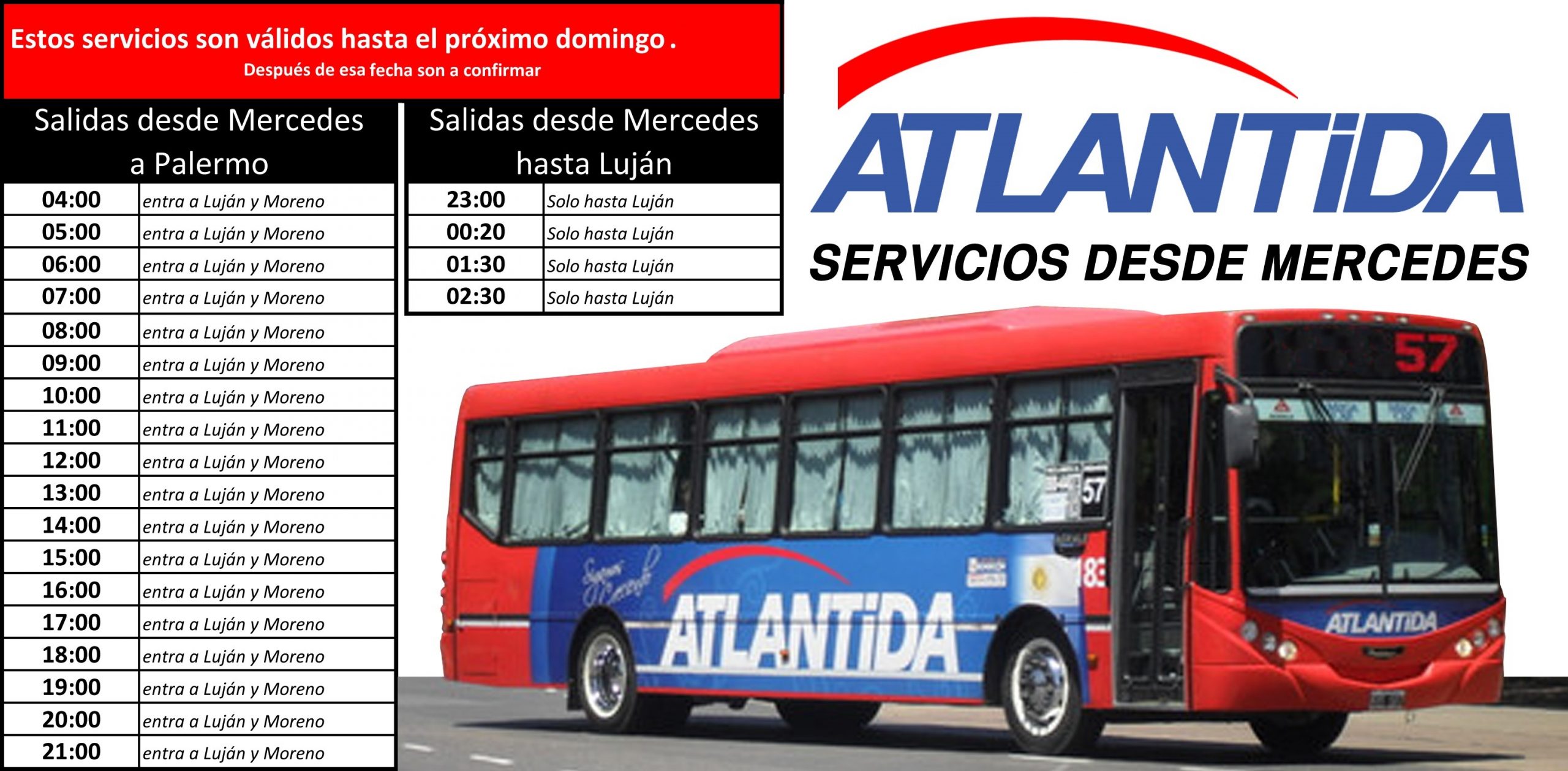 Desde la empresa Atlántida, de la línea 57, informaron que desde este lunes 10 de agosto, cambiará el recorrido de ingreso a la ciudad de Mercedes. Por obras en la Avenida 2, el ingreso por esta vía estará cerrado. Es así que mientras dure la obra (estiman unos 30 días), el recorrido de entrada y salida será por Autopista 5 y Ruta Provincial 41. El ingreso a la ciudad será por Avenida 40, siguiendo hasta avenida 29 continuando su camino hasta la Terminal de Omnibus. La información brindada asegura que el trayecto comprendido entre la autopista y ruta 41 hasta calle 40 y 17, es considerado libre para el ascenso y descenso de pasajeros, pudiendo hacerlo donde lo soliciten.