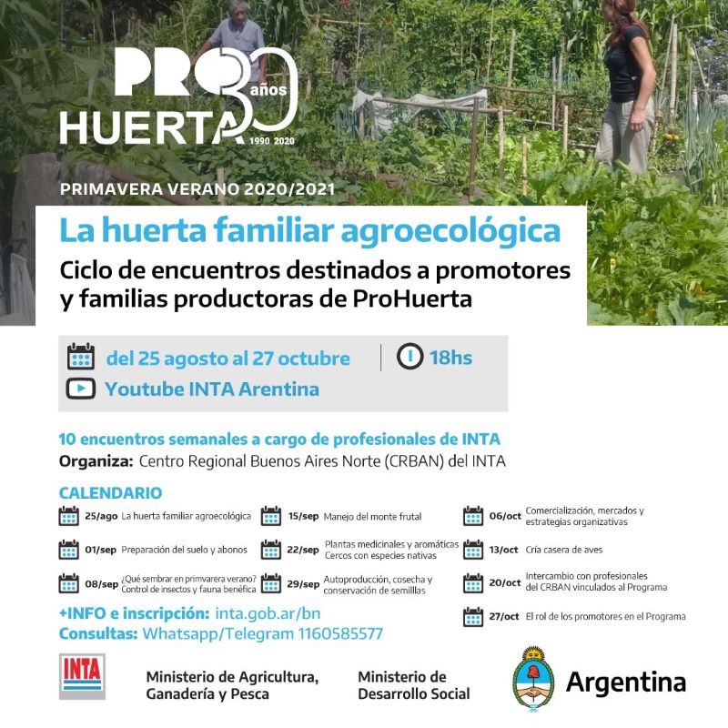 Con la participación de agentes de ProHuerta de distintas agencias del territorio, el Centro Regional Buenos Aires Norte (CRBAN) organiza e invita al ciclo de encuentros de formación, de cara a la campaña Primavera – Verano 2020/2021 y en el marco de los 30 años de la creación del Programa Prohuerta. En el contexto actual, en el que no se realizan las actividades concurrentes en espacios cerrados para evitar la circulación del COVID, y atendiendo la demanda de consultas que llegan a nuestros técnicos, las charlas y capacitaciones que al inicio de cada campaña se realizan en cada punto de nuestros territorios se trasladan a la pantalla.