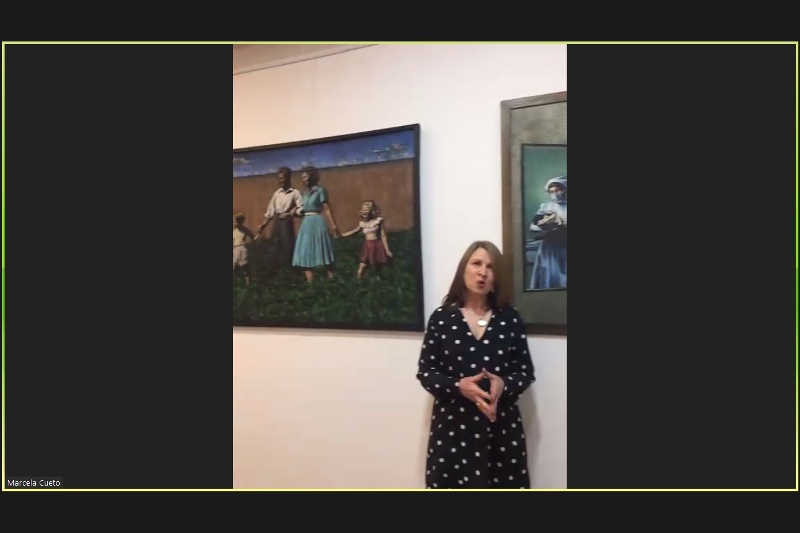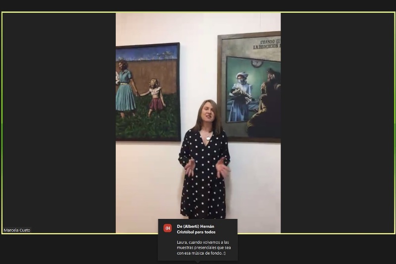 A medida que presentaba su obra, Marcela explicó la técnica y los materiales que usa. En el chat, los asistentes hacían preguntas que eran respondidas por la artista plástica. Terminado el recorrido virtual, Los presentes prendieron sus cámaras y micrófonos y pudieron hablar con Marcela. Minutos antes de la medianoche, terminó el encuentro virtual.