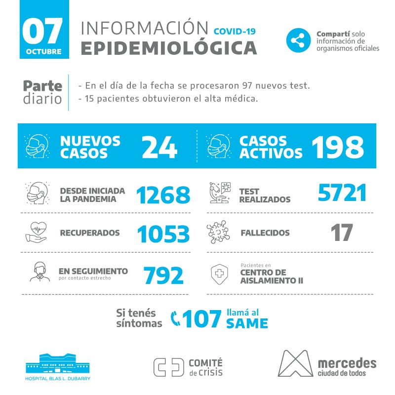 Las autoridades sanitarias dieron un nuevo parte con la información epidemiológica del día. En este informe confirman que la ciudad de Mercedes suma 24 casos positivos de covid-19 al realizarse en el laboratorio del Dubarry 97 test. Asimismo, afirman que 15 pacienes fueron dados de altas al terminar el período establecido por el protocolo para su tratamiento.