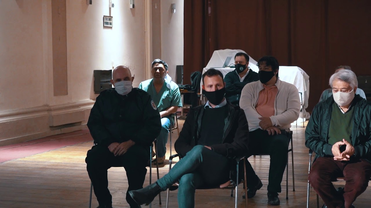 Mensaje a la comunidad. Hablan el Director del Hospital Pablo Cassiani, el Secretario de Salud Néstor Pisapia, el titular del Centro Médico Juan Carlos «Cholo» Elizalde, el médico generalista Hernán Ribero y el Intendente Municipal Juan Ignacio Ustarroz