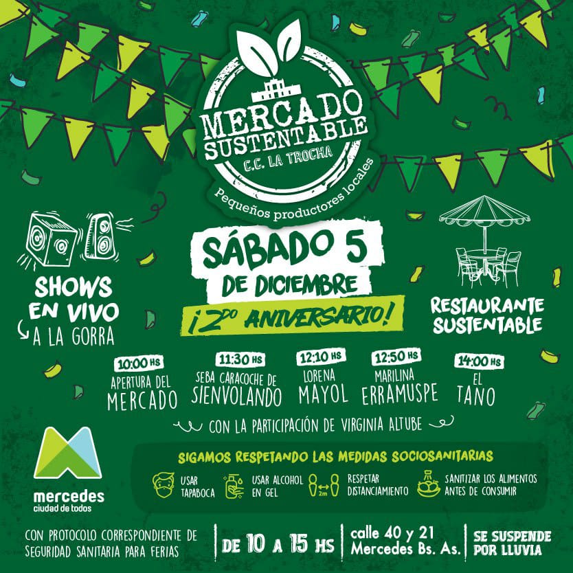 Este sábado 5 de diciembre, el Mercado Sustentable celebrará su segundo aniversario con las puertas abiertas y música al aire libre en el Centro Cultural La Trocha. Desde las 10 hasta las 15, se presentarán Sienvolando, Lorena Mayol, Marilina Erramuspe, Virginia Atube y el Tano.