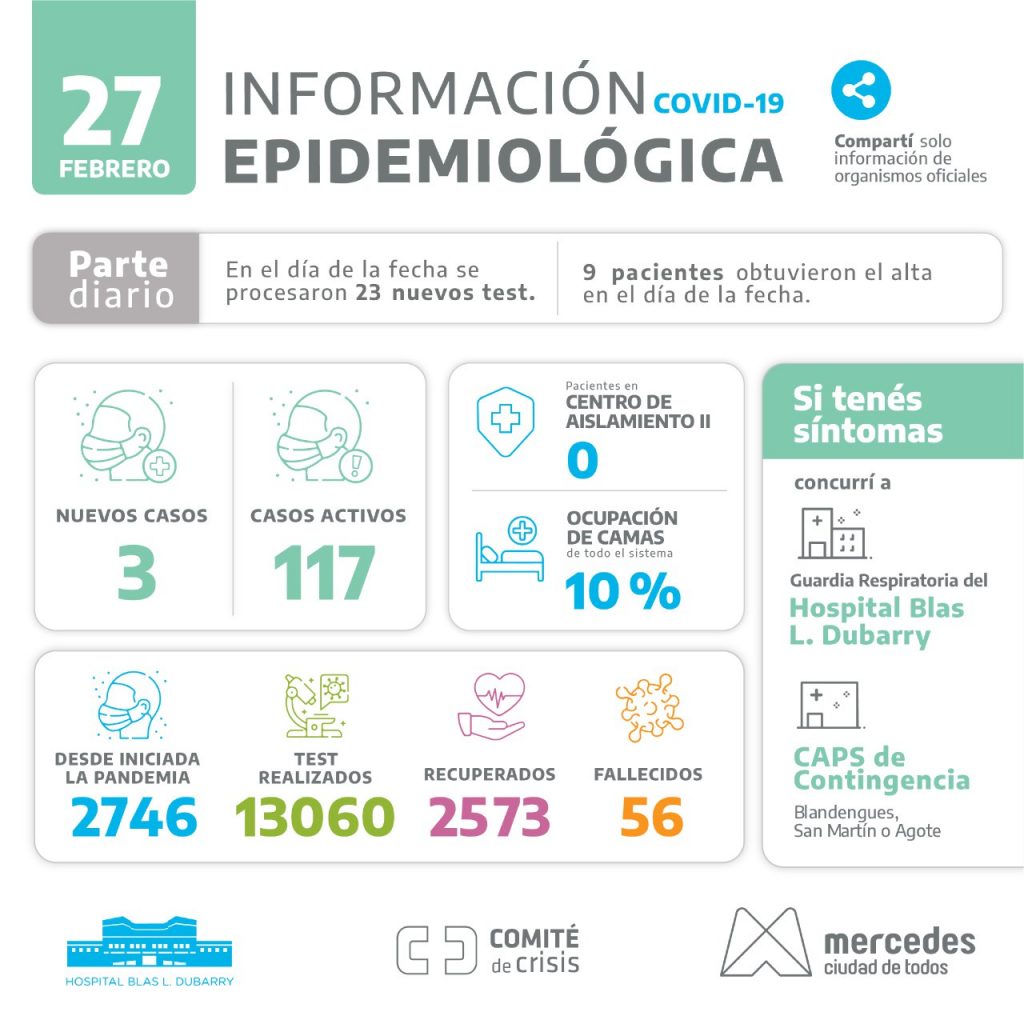 El parte diario de la situación epidemiológica en Mercedes confirma que hay tres casos nuevos positivos covid-19 entre los 23 análisis procesados en el día de la fecha por el laboratorio del Hospital Dubarry. Además, confirma que son 9 pacientes los que recibieron el alta al transcurrir los días que la enfermedad se manifiesta de acuerdo al protocolo. Con estas cifras, son 117 los pacientes que están transitando la enfermedad causada por el coronavirus que preocupa al mundo.