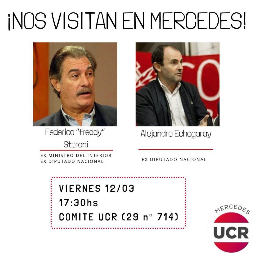Desde el Comité de Disitrio Mercedes de la Unión Cívica Radical confirman que este viernes 12 por la tarde (17:30 horas) estarán presentes Federico «Freddy» Storani, quien fuera funcionario y diputado nacional y Alejandro Etchegaray, también ex diputado nacional. La visita de ambos al Comité de avenida 29 se enmarca en las elecciones internas que tendrán los radicales en los próximos días. Por eso la reunión será para dialogaron con los correlegionarios. Previamente, los políticos atenderán a los medios de la ciudad para una conferencia de prensa.
