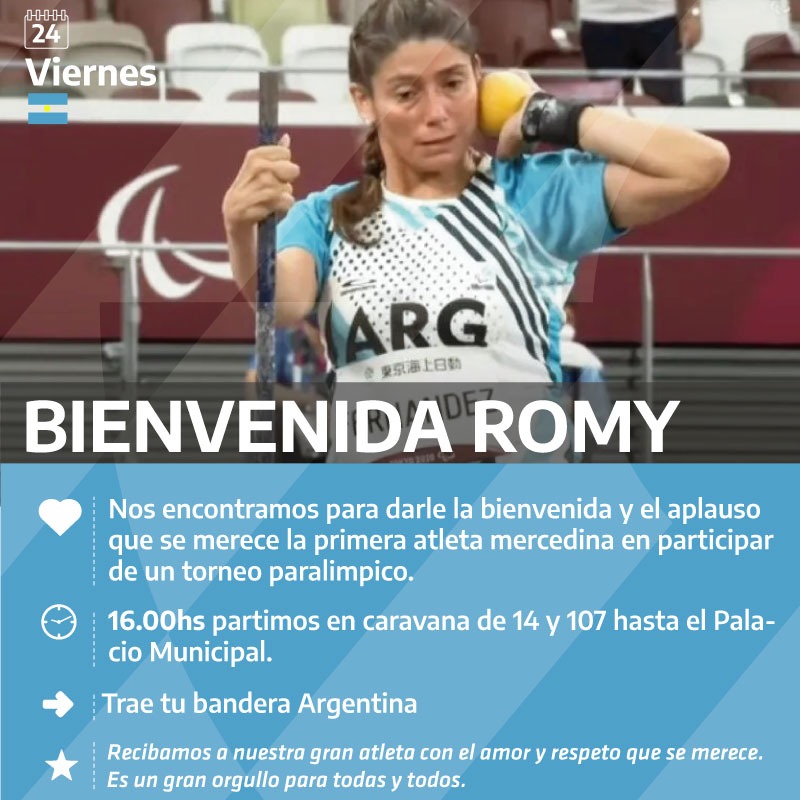 La atleta mercedina Romina Fernández participó en los Juegos Paralímpicos de Tokio. Allí compitió en dos disciplinas. En una de ella, lanzamiento de clava, Romi estableció su nuevo record personal y el del continente americano, con 19,71 metros, alcanzando el quinto puesto. También compitió en lanzamiento de la bala donde quedó séptima.
