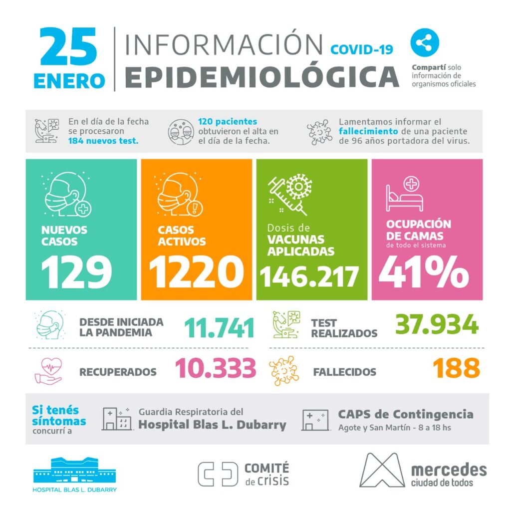 La información oficial de las autoridades sanitarias de Mercedes confirman que una paciente de 96 años portadora del virus falleció. En tanto, en la jornada de este martes confirmaron 129 nuevos casos positivos entre los 184 análisis procesados en el día de la fecha. Asimismo, informaron que 120 pacientes recibieron el alta.