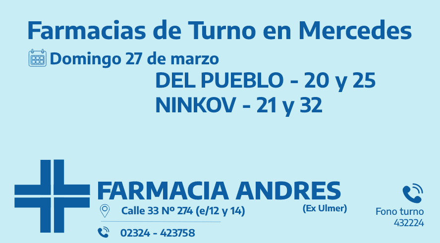 Farmacias de turno del domingo 27 de marzo 27 marzo, 2022Desde las 8:30 del día de hoy hasta la misma hora de mañana, las farmacias de turno en Mercedes son: Del Pueblo y NinkovComparte esto: Haz clic para compartir en WhatsApp (Se abre en una ventana nueva) WhatsApp Haz clic para compartir en Telegram (Se abre en una ventana nueva) Telegram Haz clic para compartir en X (Se abre en una ventana nueva) X Haz clic para compartir en Facebook (Se abre en una ventana nueva) Facebook TE PUEDE INTERESARCOMENTARIOS Comentarios