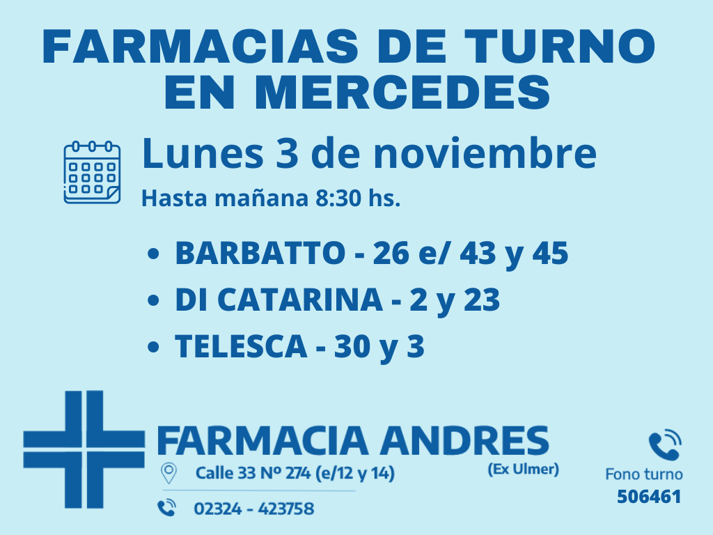 Desde las 8:30 del día de hoy hasta la misma hora de mañana, las farmacias de turno en Mercedes son: Barbatto, Di Catarina y Telesca.