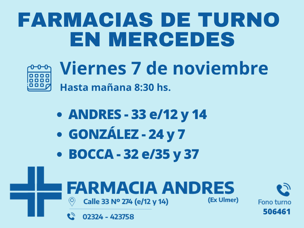 Desde las 8:30 del día de hoy hasta la misma hora de mañana las farmacias de turno en Mercedes son: Andrés, González y Bocca