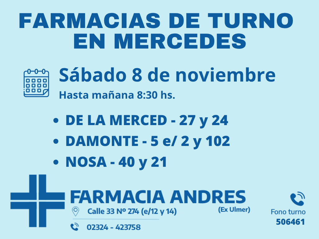 Desde las 8 30 del día de hoy hasta la misma hora de mañana las farmacias de turno en Mercedes son Mangoni, Andrés y Silvestre