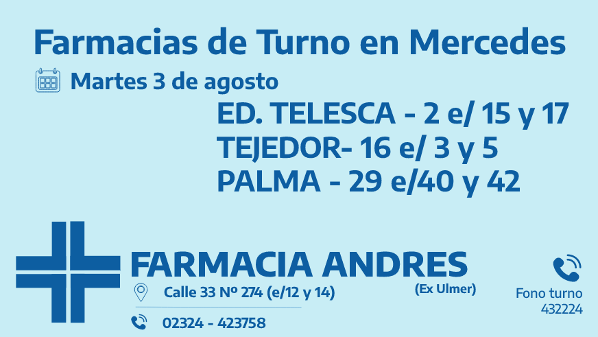 Desde las 8:30 del día de hoy, hasta la misma hora de mañana las farmacias de turno en Mercedes son: Eduardo Telesca, Tejedor y Palma