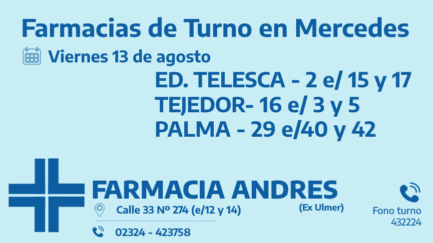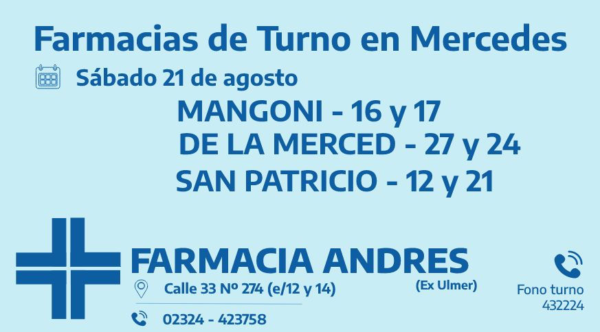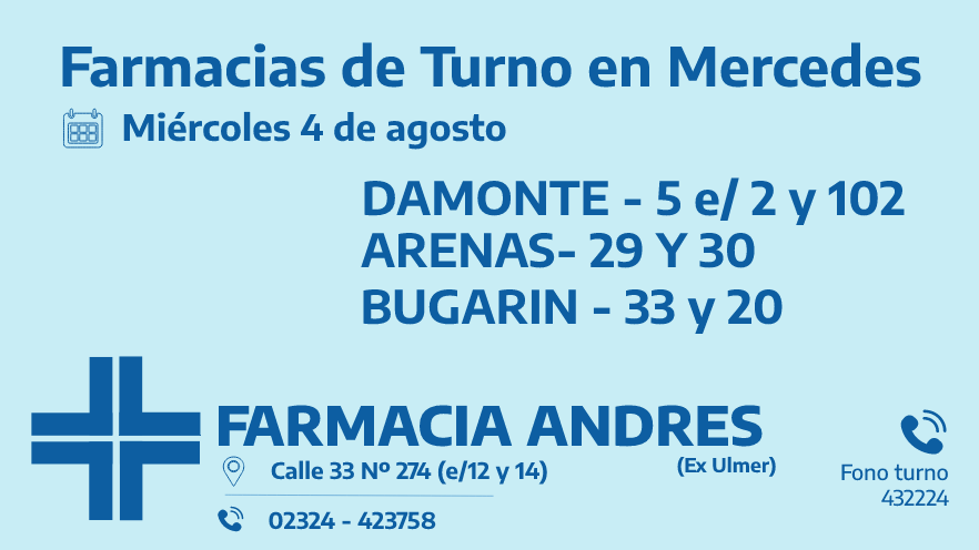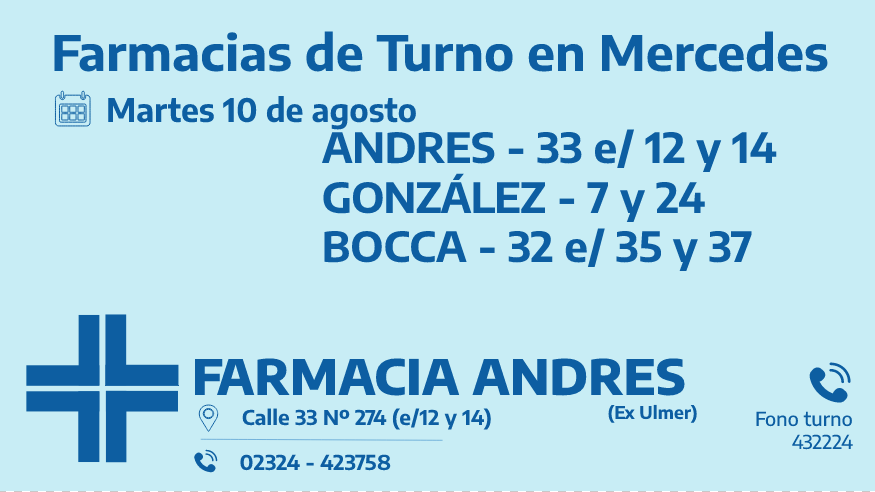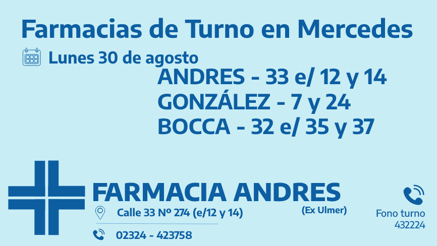 Desde las 8:30 del día de hoy hasta la misma hora de mañana las farmacias de turno en Mercedes son: Andrés, González y Bocca.