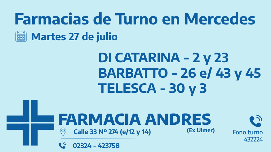 Desde las 8:30 del día de hoy, hasta la misma hora de mañana, las farmacias de turno en Mercedes son: Di Catarina, Barbartto y Telesca.