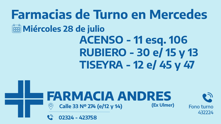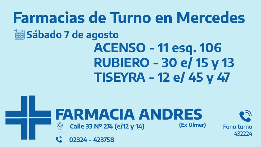 Desde las 8:30 del día de hoy hasta la misma hora de mañana, las farmacias de turno en Mercedes son: Acenso, Rubiero y Tiseyra