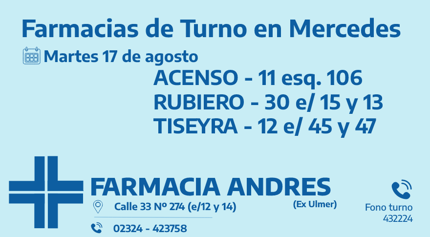 Desde las 8:30 del día de hoy hasta la misma hora de mañana, las farmacias de turno en Mercedes son: Acenso, Rubiero y Tiseyra.