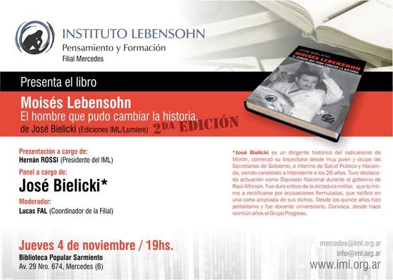 En Instituto Lebensohn de Pensamiento y Formación, Filial Mercedes, presenta en la ciudad a José Bielicki, quien vendrá para mostrar en público y comentar su libro “Moisés Lebensohn, el hombre que pudo cambiar la historia”, que va por su segunda edición a través de IML/Lumiere. La actividad será el venidero jueves 4 de noviembre, a partir de las 19, en dependencias de la Biblioteca Popular Domingo Faustino Sarmiento de Mercedes, ubicada en la avenida 29 número 674, entre 28 y 30.
