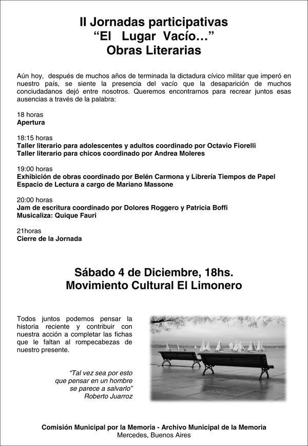 Art. 1: La Comisión Municipal por la Memoria de Mercedes invita a participar en la II Jornada participativa “El Lugar Vacío…”, en esta oportunidad, dedicada a la exposición de obras literarias, que se llevará a cabo el sábado 4 de diciembre de 2010 en el Movimiento Cultural El Limonero, entre las 18 y las 21 horas.