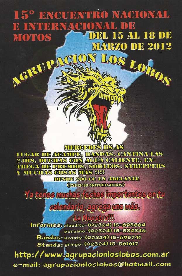 Ya se palpita en nuestra ciudad la edición 15 del Encuentro Nacional de Motos que la Agrupación Los Lobos de nuestra ciudad viene organizando con una muy buena participación a lo largo de los últimos años contando con el apoyo de la Municipalidad de Mercedes especialmente a través de la Dirección de Turismo que es quien en la actualidad se encarga de todo lo que tenga que ver con el Parque Municipal Independencia y su utilización para eventos como el que se está llevando a cabo-.
