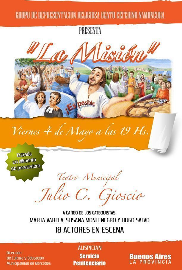 El próximo viernes 4 de mayo a las 19 horas, se presentará el grupo de representación religioso “Beato Ceferino Namuncura” integrado por internos de la Unidad 5 Mercedes, de la obra “La Misión” que se refiere a la obra de Jesús con los pobres, los enfermos, etc., en la sala A del Teatro Municipal,