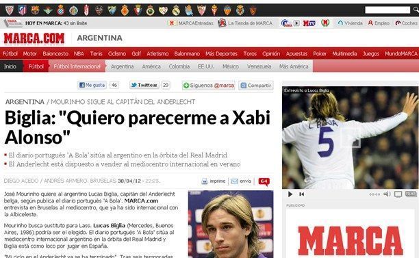 El famoso diario deportivo «Marca», uno de los más influyentes y leído en España sostiene que el Real Madrid irá tras los pasos de Lucas Biglia quién claramente tiene intenciones de migrar a una liga distinta a la belga, incluso, ha declarado que quiere parecerse a Xavi.