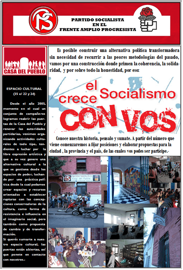 Para esta actividad hemos realizado un primer boletín informativo con un resumen de la historia partidaria y su intervención en la historia de nuestro país, desde su fundación el 26 de junio de 1896 hasta la actualidad. A su vez, contará con una carta de nuestro presidente partidario, Dr. Hermes Binner y el compromiso de los socialistas con nuestra sociedad. También es nuestro objetivo continuar con la elaboración de boletines informativos sobre nuestras actividades y nuestro trabajo territorial y cultural, como así también nuestra postura sobre cuestiones de índole local, provincial y nacional