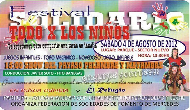 El sabado 4 de agosto se realizara un festival solidario, en el parque sector nuevo, el evento tiene como objetivo recaudar alimentos y leche que luego seran repartidos en los distintos barrios de la ciudad, inicio del mismo es a las 13:30 hs a las 15:00 hs esta programado el show de pelambre y matambre , el cierre esta a cargo de las bandas mercedinas «En busca cumbia» y EL refugio».