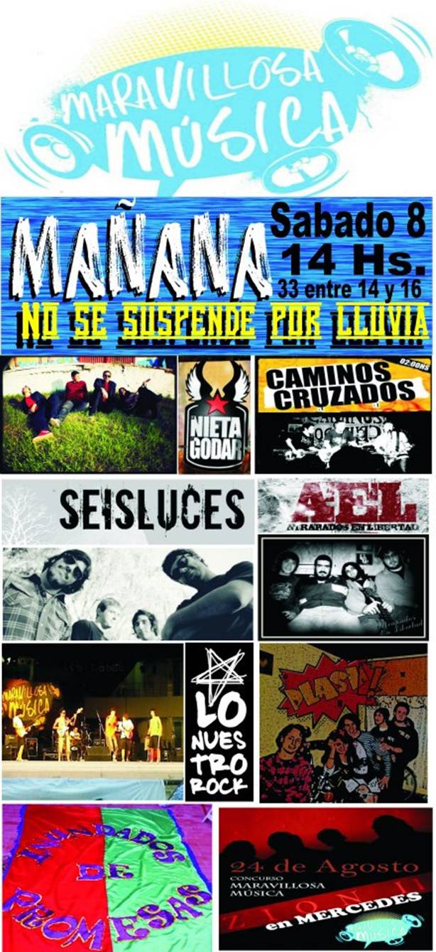 Actuarán: Seis Luces, Caminos Cruzados, Atrapados en libertad, Nieta de godar, Lo nuestro rock, Splash e inundados de promesas.