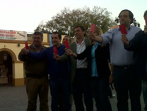 Carlos Selva, junto a funcionarios, hizo su foto con la tarjeta roja del «sacale roja a la violencia»