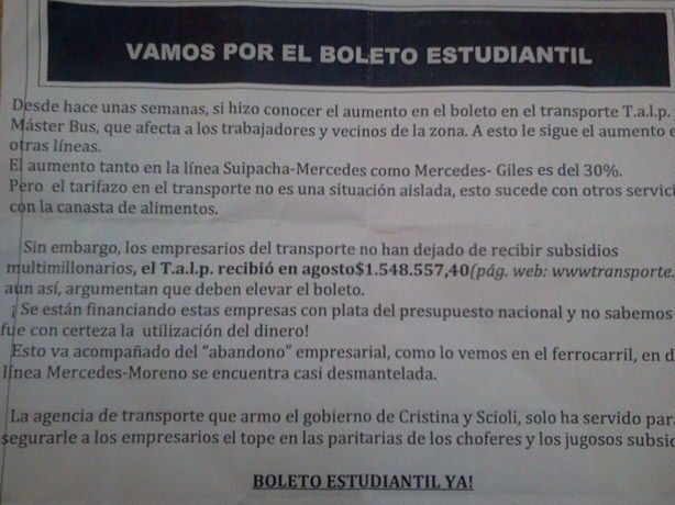 El fin de semana fue una ocasión para que, por ejemplo, integrantes del Partido Obrero local distribuyeran un documento titulado “vamos por el boleto estudiantil” donde mostraban la importancia de contar con un servicio especial para los educando. En él sostienen que no es necesario el aumento pues continúan recibiendo subsidios, como T.A.L.P que recibió en agosto $1.548.557,48, según consta en el sitio de internet del Ministerio del Interior y Transporte.