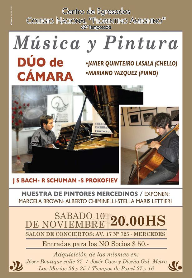 El próximo sábado 10 de Noviembre a las 20Hs se presentará en la Sala de Conciertos del Colegio Nacional «Florentino Ameghino» de Mercedes el «Dúo de Cámara» integrado por Javier Quinteiro Lasala (Violoncello) y Mariano Vazquez (Piano) interpretando obras de J.S Bach, R Schumann y S. Prokofiev. A