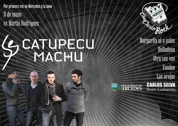 Se han puesto a la venta las entradas para la presentación de la banda “Catupecu Machu” en nuestra ciudad. Es la primera vez que el grupo liderado por Fernando Ruíz Díaz se presenta en mercedes y la zona de ahí que se convierte en una gran oportunidad para estar cerca de una de las más grandes agrupaciones del rock nacional.