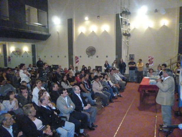 El salón de actos de la parte inferior del teatro estaba prácticamente completo. Funcionarios, vecinos y adjudicatarios en dicho lugar seguían cada momento del encuentro en el cual se les concretaba parte de su deseo: tener la firma en las escrituras de sus viviendas o terrenos.