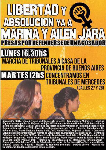 Tiempo atrás, Marcela, una de las integrantes de agrupaciones que bregan por la libertad de Ailén y Marina nos contaba: “Esta situación es de dos jóvenes de un barrio de Paso Del Rey, del Partido de Moreno, que fueron acosadas históricamente por un personaje vendedor de drogas, ex presidiario, donde un día volvían las chicas de bailar y sabiendo él las podía atacar se fueron con un elemento para defenderse. Él las amenazó con un revolver, disparó un tiro, gatilló y no salió, se abalanzó sobre una de las chicas intentando sacarle la ropa ante lo cual una de las hermanas sacó un cuchillo de untar manteca, es decir, de punta redonda, y lo pinchó en la espalda, logrando salir corriendo. Una vez allí se bañaron y esperaron a la policía porque ya había denuncia efectuada contra ellas. Hicieron la denuncia por el intento de abuso, acoso y dentro del marco de legítima defensa y el comisario le cambió la declaración obligando al Cabo que se las tomó a colocar “intento de homicidio”. Desde ese momento están presas, primero en Marcos Paz y ahora en el Penal 8 de Los Hornos. Estas chicas están desde 2011 presas, una de ellas con un problemas de salud teniendo que ser atendida tres veces ya. Hoy estamos muy preocupados. Está en el hospital San Martín de La Plata atendida por un quiste en un ovario, con infecciones y otras cuestiones. Pedimos la libertad inmediata, por cuestiones de salud y no sabemos en qué puede derivar estos atrasos. Tenemos una estrategia legal de la compañera Claudia Ferrero, de APEL, del Partido Obrero, apoyamos a la mamá en todo lo que decida. Desde ahí acompañamos”.
